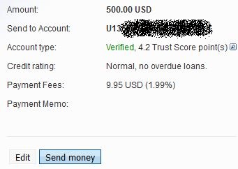 Kliknutím na "send money" platbu potvrdíme. Položka "payment fees" ukazuje poplatek, který platí odesilatel.